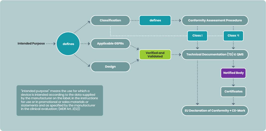 - Determines device classification which defines the conformity assessment procedure needed for CE marking